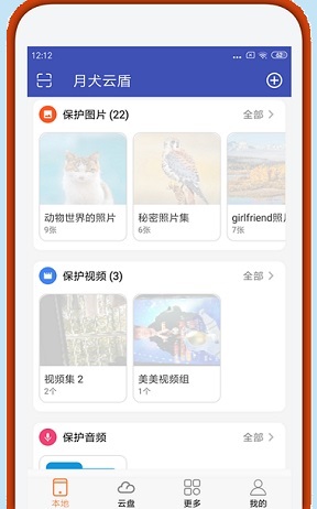 月犬云盾App对手机上的照片、视频、文件进行加密。文件在密文状态下进行跨终端访问。